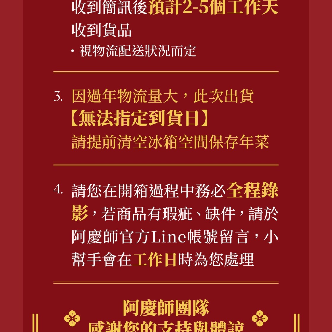 冷凍宅配,已開始依照訂單順序「陸續出貨」(不含週休及國定例假日),出貨時簡訊通知,麻煩您留意手機簡訊。