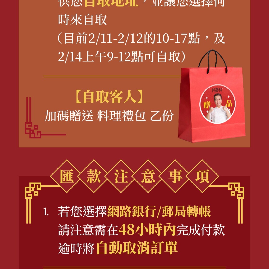 成分:糯米、蝦乾(產地:臺灣)、老薑、香菇、豬肉絲(產地:臺灣)、黑麻油、米酒(米、水)、阿慶師黑豆醬油(黑豆、蔗糖、食鹽、轉化液糖(蔗糖、水))、味醂(水、糯米、米麴、葡萄糖、酵母精粉、鹽)、雞翅(產地:臺灣)、阿慶師黑豆醬油膏(水、非基改黑豆、蔗糖、糯米、轉化液糖(蔗糖、水)、酵母萃取物、甘草粉)、蔥、蒜頭、洋蔥、白胡椒粉、黑胡椒粉、八角、肉桂、月桂葉、冰糖、香油、白芝麻