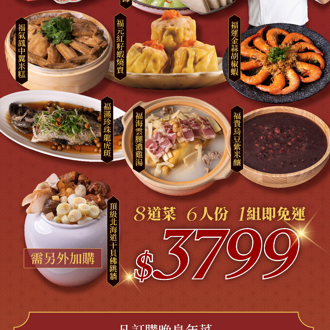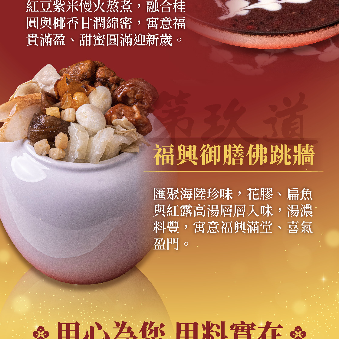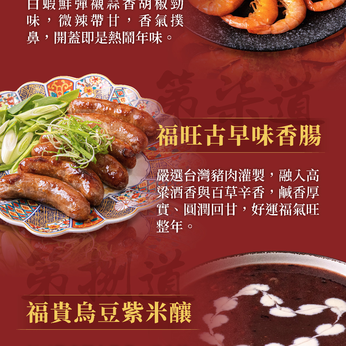成分:高湯(水、大骨(產地:臺灣)、紅露酒)、排骨酥(產地:臺灣)、豬腳(產地:臺灣)、花膠(產地:臺灣)、魚皮(產地:臺灣)、大白菜、筍片、鳥蛋(產地:臺灣)、栗子、香菇、紅棗、蒜仁、肉扁魚(產地:臺灣)、白胡椒粉、冰糖、鹽、蠔油(蠔汁(蠔、水、鹽)、糖、水、調味劑(L-麩酸鈉)、鹽、黏稠劑(羥丙基磷酸二澱粉)、小麥粉、著色劑(焦糖色素))