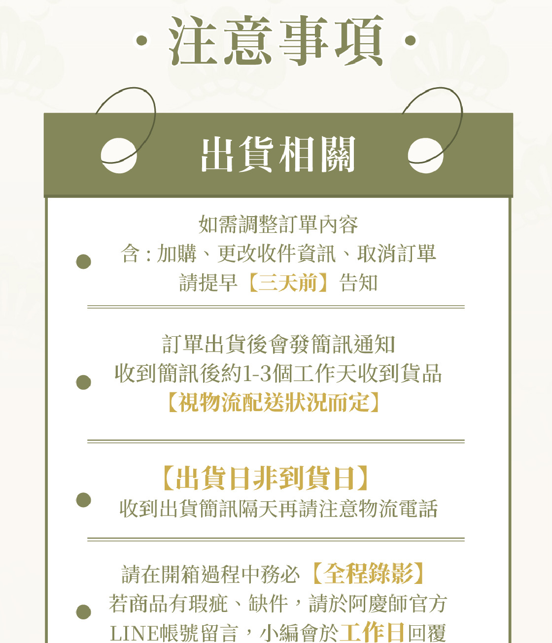 冷凍宅配,已開始依照訂單順序「陸續出貨」(不含週休及國定例假日),出貨時簡訊通知,麻煩您留意手機簡訊。